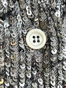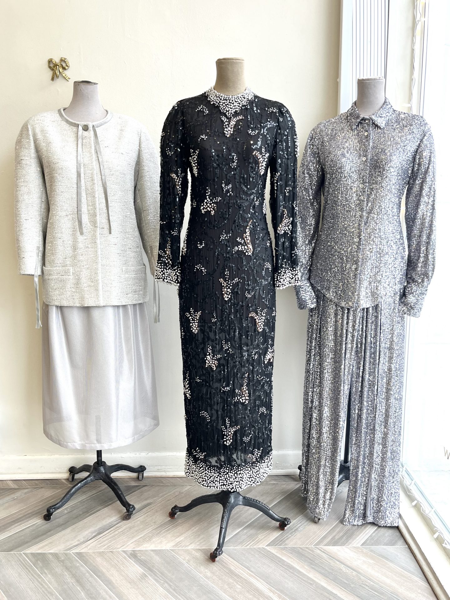 Happy New Year’s Eve! We’ve got some sparkles on display for you including this rare 1970’s Galanos gown front and centre. It’s made of sheer silk chiffon that’s been encrusted by hand with beads, pearls, sequins and crystals. Very glamorous and light catching. She’s flanked by her two silver besties, Tom Ford and Chanel. More details below. Clink clink kittens.