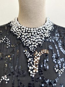 C~Galanos 1970’s hand beaded black chiffon gown, size 4, $2,495.
