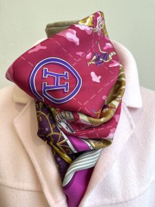 C~Prada cashgora baby pink coat, size XS-S, $1,995. Hermes silk scarf, $449.