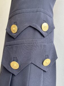 R~Loewe Anagram fuzzy top, size XS-S, $649. Chanel 1994 wool pleated skirt with logo button sailor front, size 16, $895.