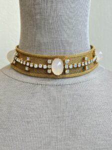 L~Versace 2010 lambskin dress with corset hooks, size 2, $1,995. 1960’s opalescent crystal choker, $395.