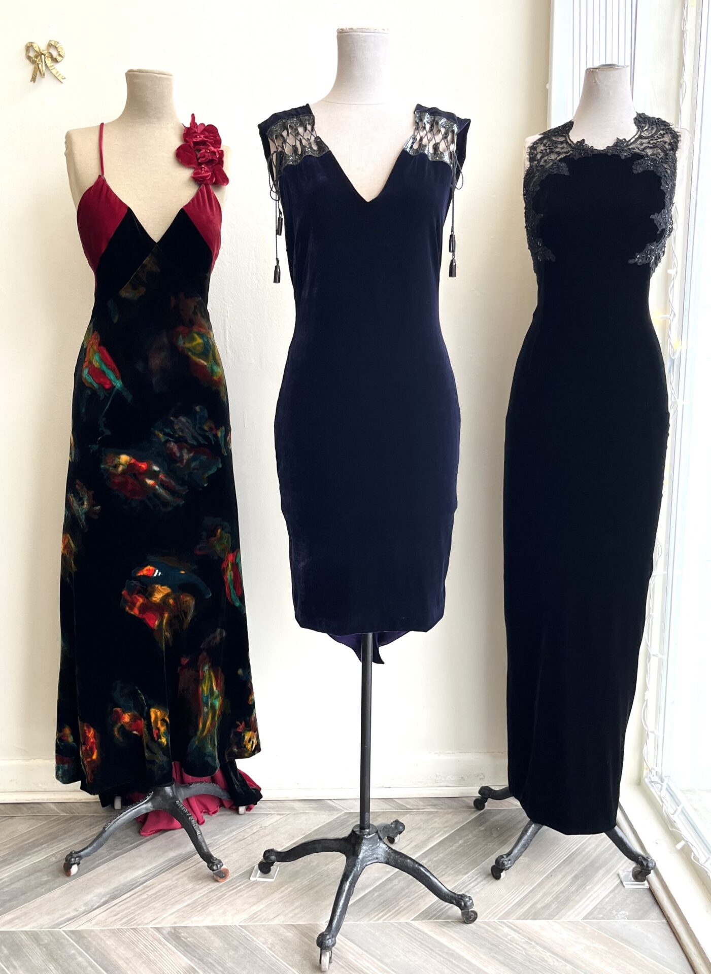 Happy New Year’s Eve! We’ve got some sparkles on display for you including this rare 1970’s Galanos gown front and centre. It’s made of sheer silk chiffon that’s been encrusted by hand with beads, pearls, sequins and crystals. Very glamorous and light catching. She’s flanked by her two silver besties, Tom Ford and Chanel. More […]