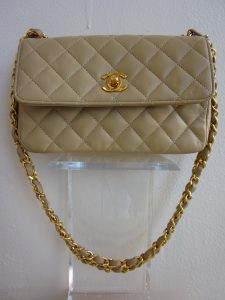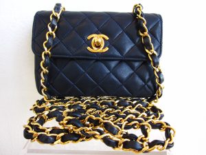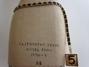 On this 25th day (5×5!) we present a Chanel gold chain with navy leather belt & large square 5 fob. This nice little number measures 40″ in length Sold. Secondly, we have a navy leather mini Chanel classic shoulder purse with gold hardware. It measures 5.5” x 2″ x 4” Sold. Please contact us for more details.