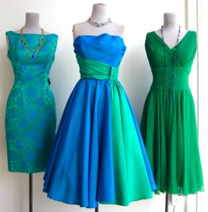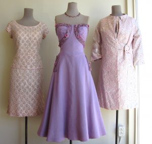 Left 1960’s hand beaded 2 pc. is a size 12. Centre 1950’s strapless number is a 6-8, and the right jacket & dress combo is a size 6.