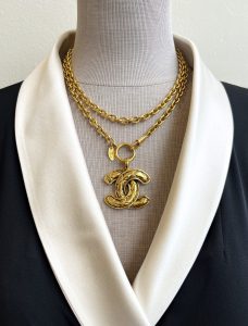 L~Chanel 1990’s silk wrap dress, size 4, $1,795. Chanel 1990’s long chain necklace (we’ve doubled it up), $1,795.