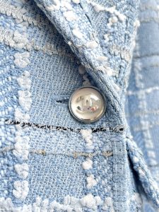 R~Chanel 2023 tweed jacket, size S, $5,995 (new with tags). Hermes “Des Fleurs pour le Dire” silk scarf, $395. Chanel navy cotton knit pants, size XS, $1,695.