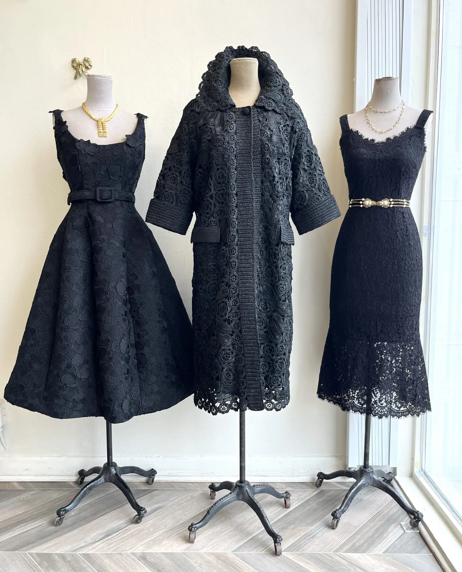 If you love texture in your textiles, step into our luxurious lace display. On the left, we feature a brand-new Oscar de la Renta Guipure lace frock that’s absolutely to die for. Front and center, you’ll find a 1960s hand-crochet raffia jacket, purrrfect for those seeking a bit of coverage. On the right, Dolce & Gabbana offers a figure-hugging piece with a stretchy, soft silk lining that feels as good as it looks.