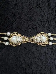 R~Dolce & Gabbana black lace dress, size 6, $1,595. 1960’s pearl, crystal and chain belt, size 6-8, $395. 1970’s pearl and crystal necklace (doubled up, can be worn longer), $225.