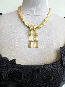 L~Oscar de la Renta black Guipure lace dress, size 8-10, $3,295 (new with tags). 1970’s gold tassel necklace, $475.