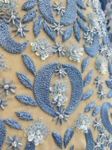 Happy New Year’s Eve! We’ve got some sparkles on display for you including this rare 1970’s Galanos gown front and centre. It’s made of sheer silk chiffon that’s been encrusted by hand with beads, pearls, sequins and crystals. Very glamorous and light catching. She’s flanked by her two silver besties, Tom Ford and Chanel. More details below. Clink clink kittens.