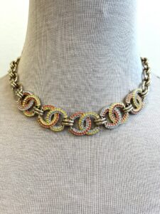 C~LoveShackFancy bias cut ruffle gown, size XS-S, $849 (new with tags). Chanel 2023 crystal logo necklace, now on SALE $1,149.