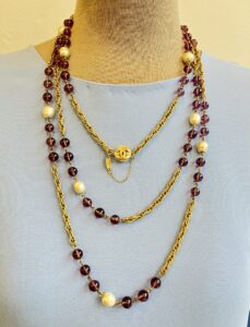 L~Carolina Herrera runway strapless dress with jewel encrusted pockets, size 6-8, $2,395. Two 1970’s crystal necklaces (doubled up), $195 each.