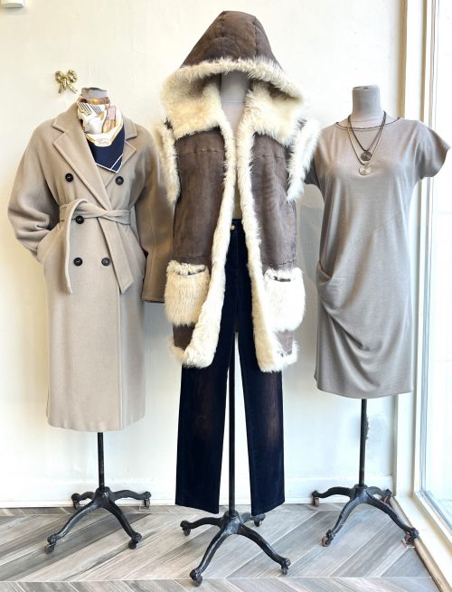 Firstly, a big THANK YOU to all who ventured out for our sale last Saturday! We had alot of fun and laughs and we hope to see you again at our next 50% off event. Now onto this delicious mushroom hued window that we put together for you. There is your classic, your casual and then we have that FABULOUS Chanel shearling hooded vest in the middle. We were blown away when it came into the shop and we all had to give it a try on to release our inner Penny Lane.