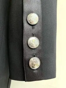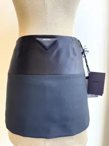 L~Chanel 1997 double breasted tux jacket with silver logo buttons, size 6, $2,895. Prada 2023 cummerbund mini skirt, size 0-2, $849 (new with tags).