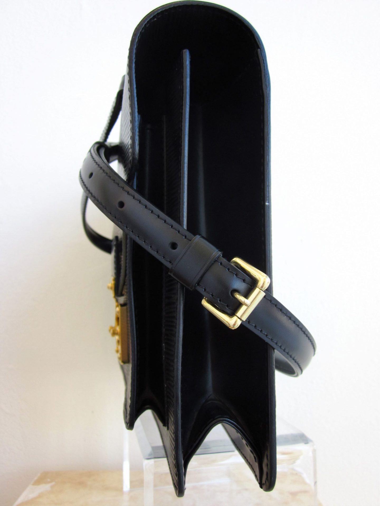 LV black epi Demi Lune purse. Measures 10″ x 2″ x 6½”.