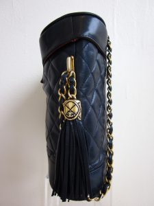 Chanel 1980’s navy quilted lambskin binocular purse with gold hardware. Gently worn. Measures 11″ x 4″ x 8.5″. Strap is 43″ in length.