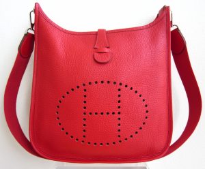 Hermes 2005 Evelyne PM in Rouge Vif Clemence. Measures 11″ x 3″ x 12″, strap is 36″. Sold