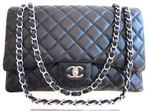 Chanel black lambskin single flap Maxi with silver hardware. Measures 13″ x 4″ x 9″.