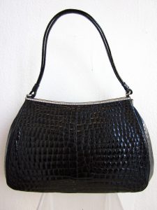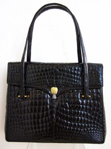 We are fortunate enough to have received another beautiful bundle of Morabito crocodile purses. So let’s snap to it, shall we? In smallest to largest order, we start with a black croc evening purse with diamonte frame and clasp. It measures 9.25″ x 3″x 5.5″ Sold. The middle beauty is a double strapped black croc purse with flap cover and pineapple clasp. It measures 9″ x 2.75″ x 7″. And the big momma of the bunch is a Kelly style black croc with gorgeous shiny brass hardware. It measures 12.5″ 3.25″ 8.5” Sold. Please contact us for more details.