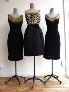 These golden speckled dahhhhlings are making their window debut. Featuring hand beaded and sequined bodices paired with black, they are conservative chic. Great for a multitude of events. Catch them while you can.