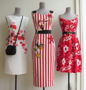 Aren’t these red and white dresses just juicy?!? I do believe that they were made for sipping sangrias in. How to-die-for-summer-chic is that runway Dolce & Gabbana piece in the centre? From the peppermint stripes to the lady sitting on the waistband holding a sequined beach ball to the 3-D beaded starfish, to the EVERYTHING! It’s summer 2017, in a dress. I hope you enjoy this window as much as I enjoyed putting it together.