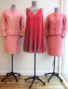 Love is in the air and our window for Valentine’s day. What could be more lovely than a pink wool bouclé Chanel suit? Well we’ve got two of them and the sweetheart on the right is couture from the 1950’s. She comes with some provenance as well as she once belonged to a model that worked for the house of Chanel. Rumour has it that while Mlle Coco herself was doing a fitting on her that she actually pinched her nipple! Intentional or not we may never know, but love is love.