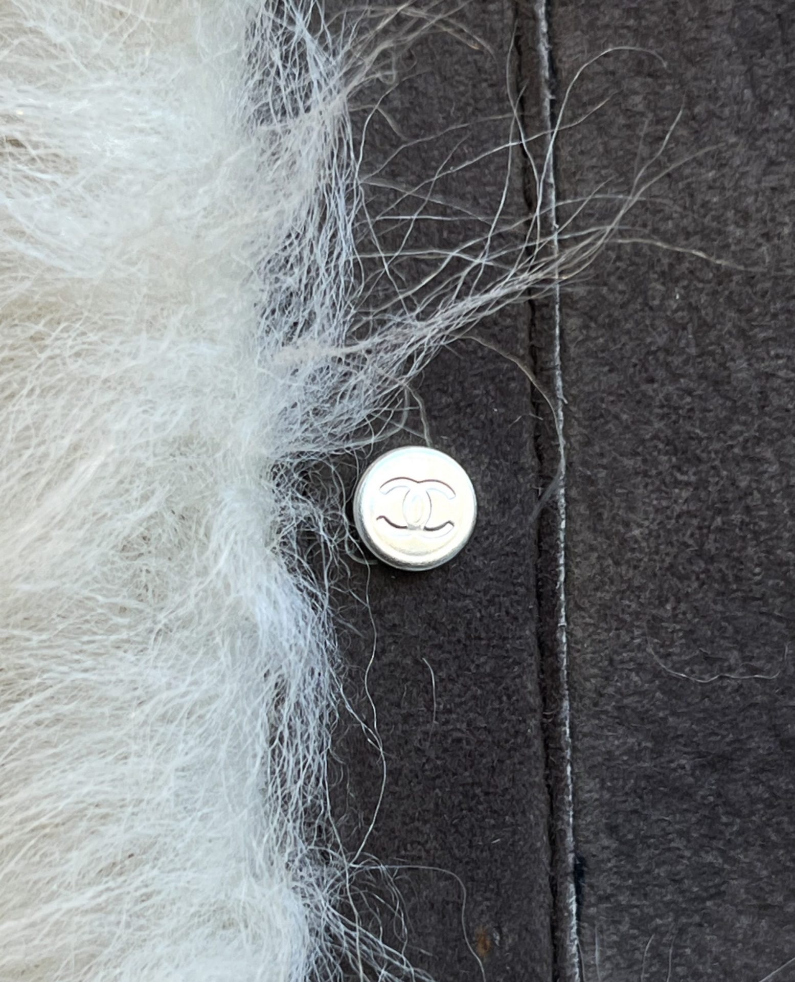 C~Chanel shearling hooded vest, $3,995. Chanel velour jeans, size 8, $695.