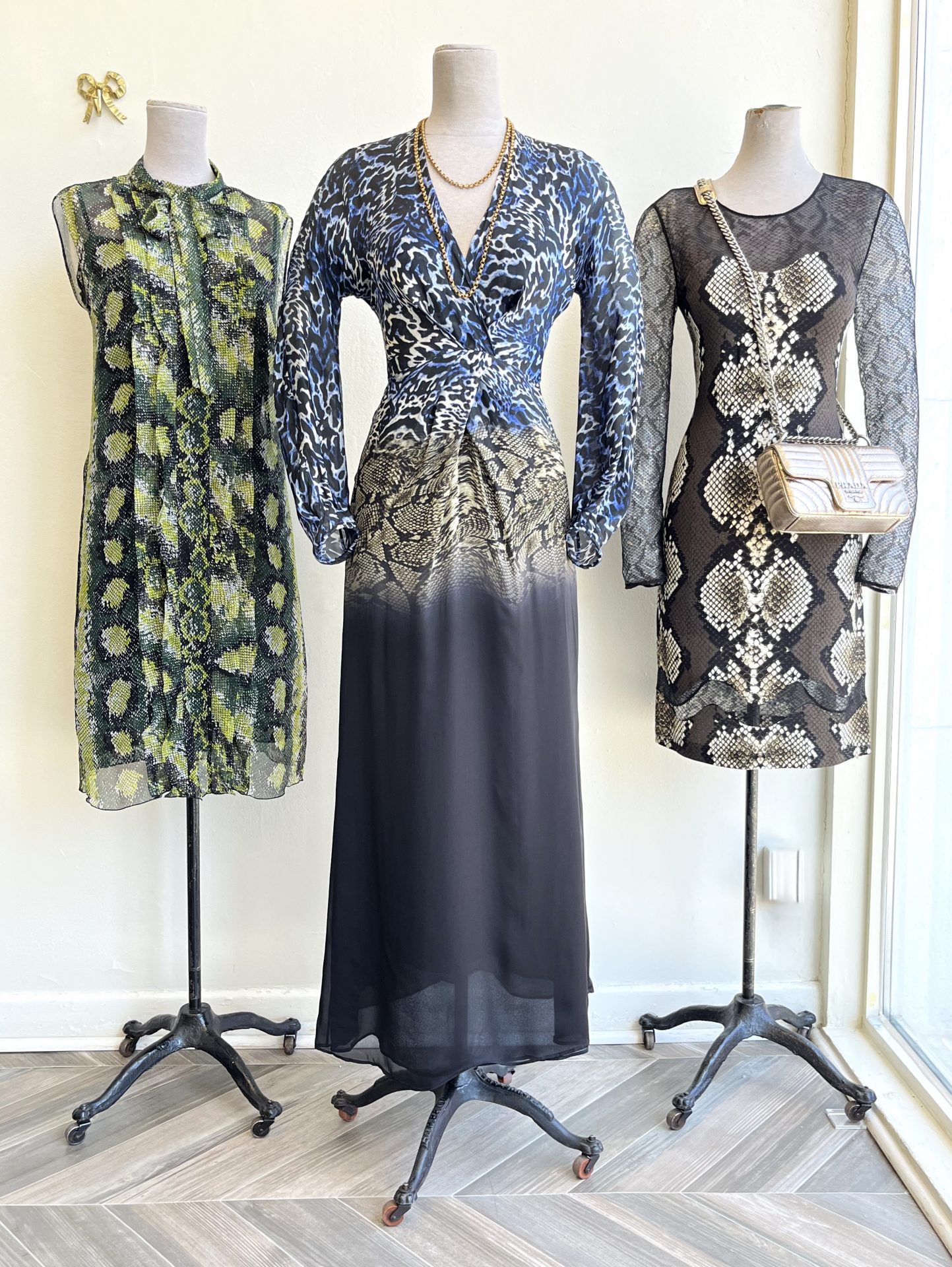 R~Roberto Cavalli snake lace dress, size 6, now on sale for $325. Prada Diagramme purse in gold snakeskin, $1,695.