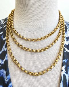 C~Giambattista Valli silk gown, size 4, $1,095. 1940’s stamped brass chain long necklace, $295.