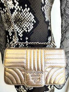 R~Roberto Cavalli snake lace dress, size 6, now on sale for $325. Prada Diagramme purse in gold snakeskin, $1,695.