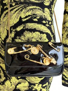 R~Versace knit mini dress, size XS-S, $995. Versace black patent crossbody purse with gold safety pins, $1,195.