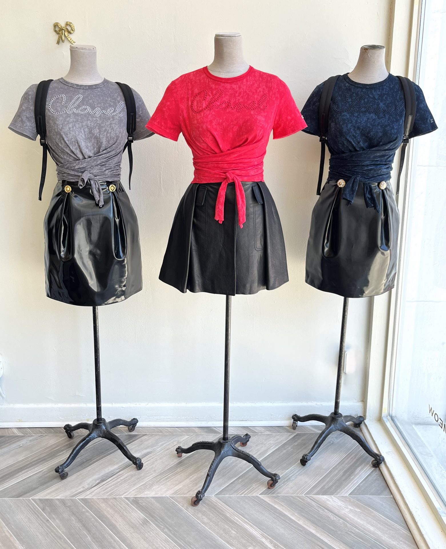 C~Chanel 2020 mottled pinkish red cotton embroidered logo shirt with tie front, size S-M, $1,495. Dior 2020 lambskin leather skirt, size 2, $1,995.