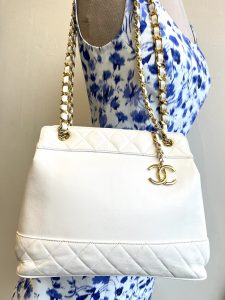 L~Oscar de la Renta warped cornflower print cotton dress, size 8, $1,195 (new with tags). Chanel 1990 white leather shoulder bag, $2,895.