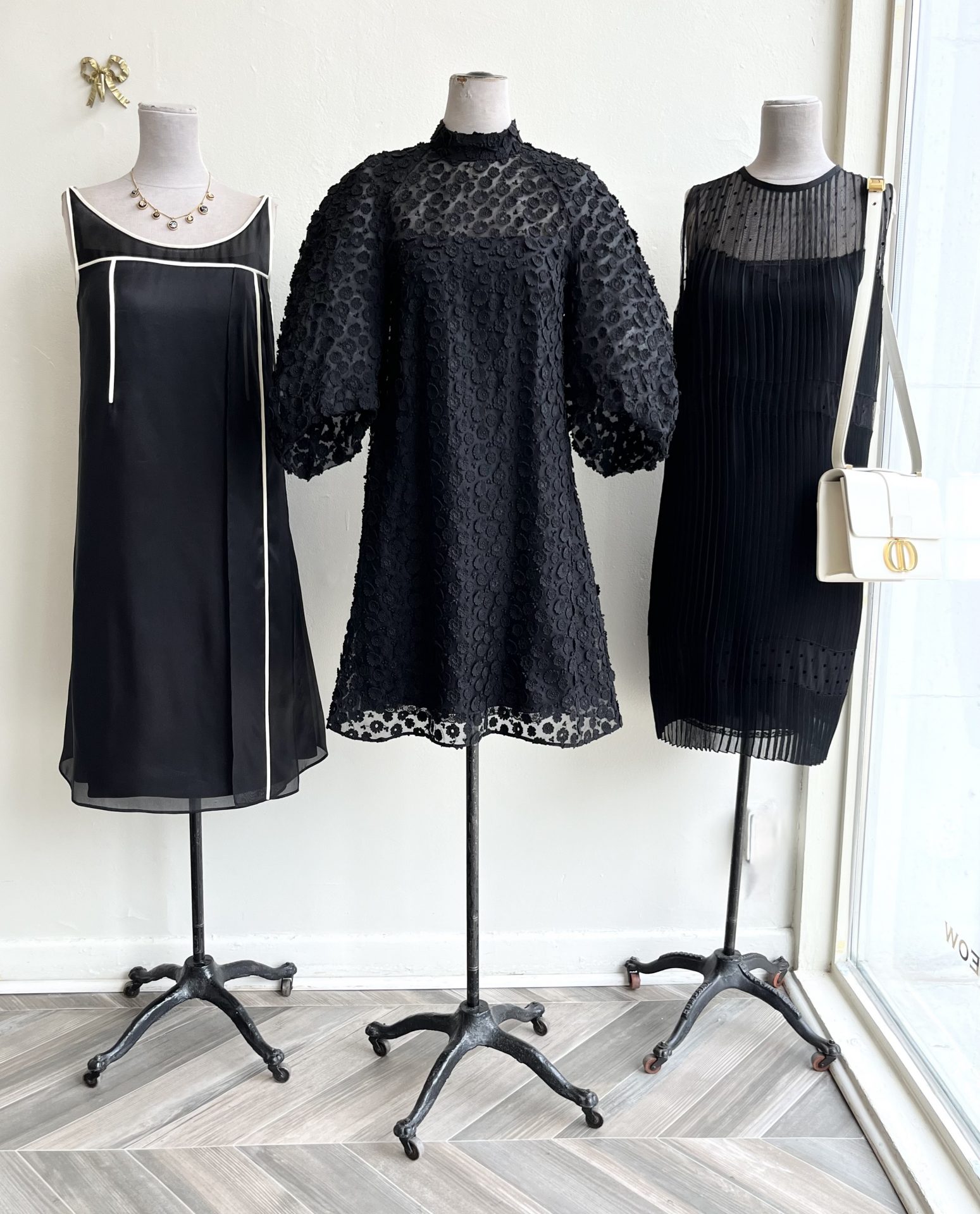 Sheer madness will ensue when you hit the streets in these fab LBDs. Its all about what’s on top – pretty pleats, 3-D flowers and satin trim. Underneath, gorgeous, luxurious silk slips. The detail in these three dresses require a second, third and fourth look and they’ll get it.