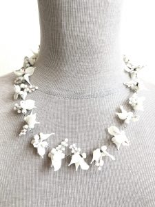 R~Dolce & Gabbana black crepe with cherry blossom print rouched dress, size 8-10, $1,095. 1950’s hand blown white glass bird necklace, $325.