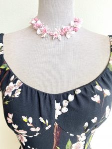 L~Dolce & Gabbana black crepe with cherry blossom print dress with cap sleeves, size 4, $995. 1950’s hand blown pink glass floral necklace, $295.