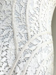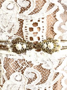 C~Dolce & Gabbana white lace dress, size 6-8, $2,595. 1960’s chain, pearl & crystal belt, measures 35.5″, $395.