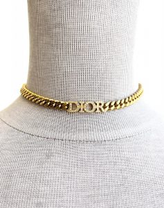 R~Dior cream double breasted top, size 2-4, $2,495. Dior silk slip with pleated lace maxi skirt, size XS-S, $1,849. Dior chain choker with crystal logo, $695.
