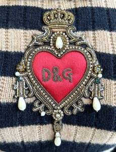 C~Dolce & Gabbana sacred heart wool and cashmere sweater, size S, $795. Vintage Bill Blass taffeta ball skirt, size 4-6, $595.