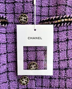C~Chanel 2022 lilac and black cotton tweed skirt suit, size 0-2, $7, 495 (new with tags).