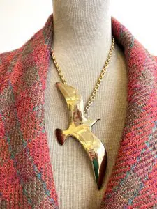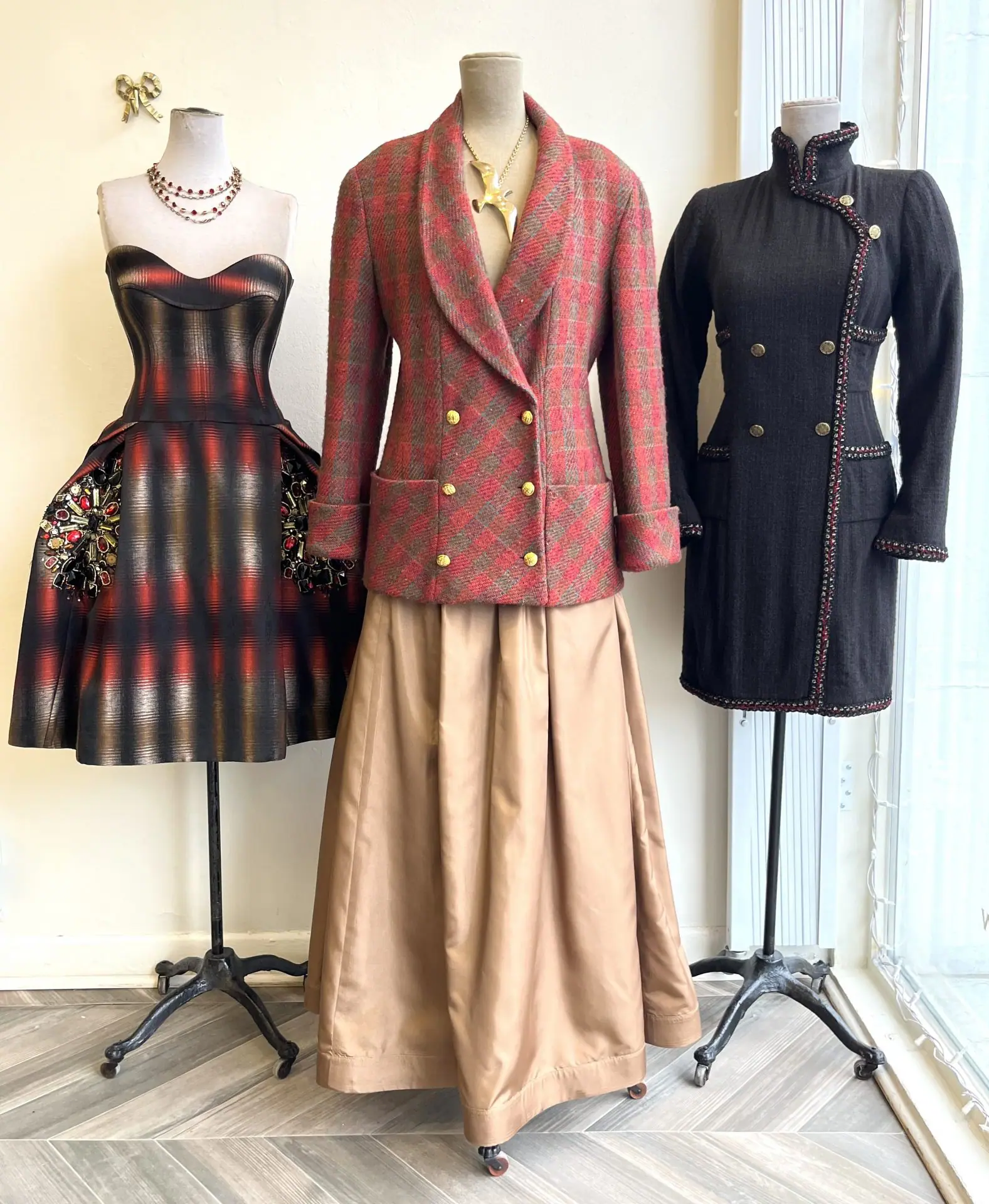 C~Chanel 1980’s tweed jacket, size 10-12, $1,895. Bill Blass 1980’s taffeta ball skirt, size 6, $595. 1970’s seagull necklace, $475.