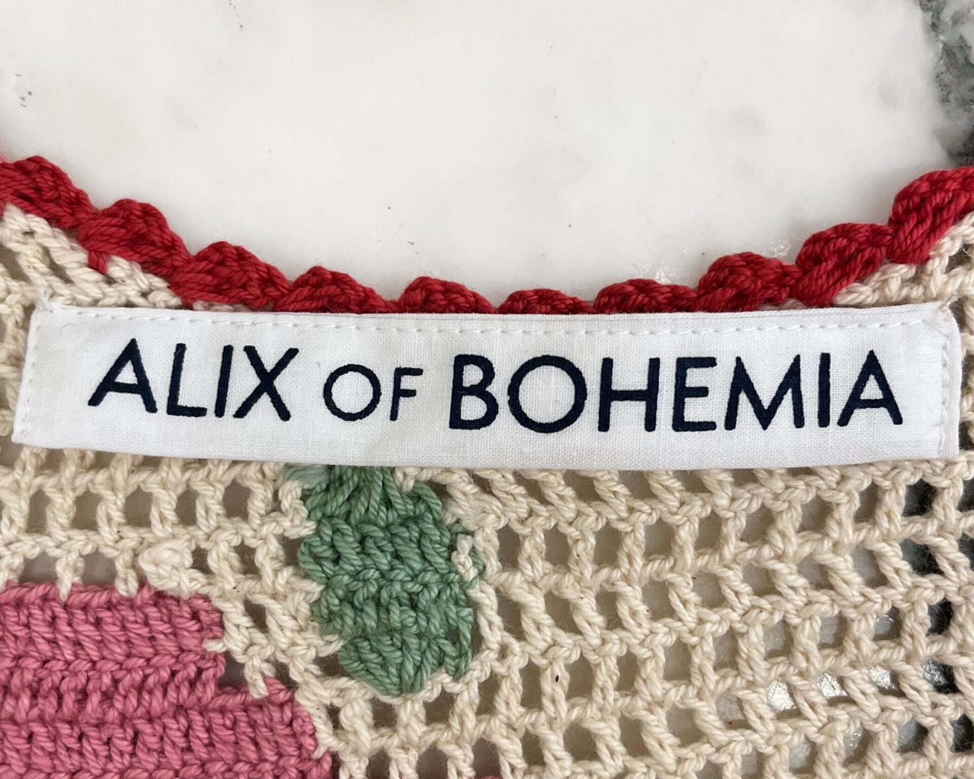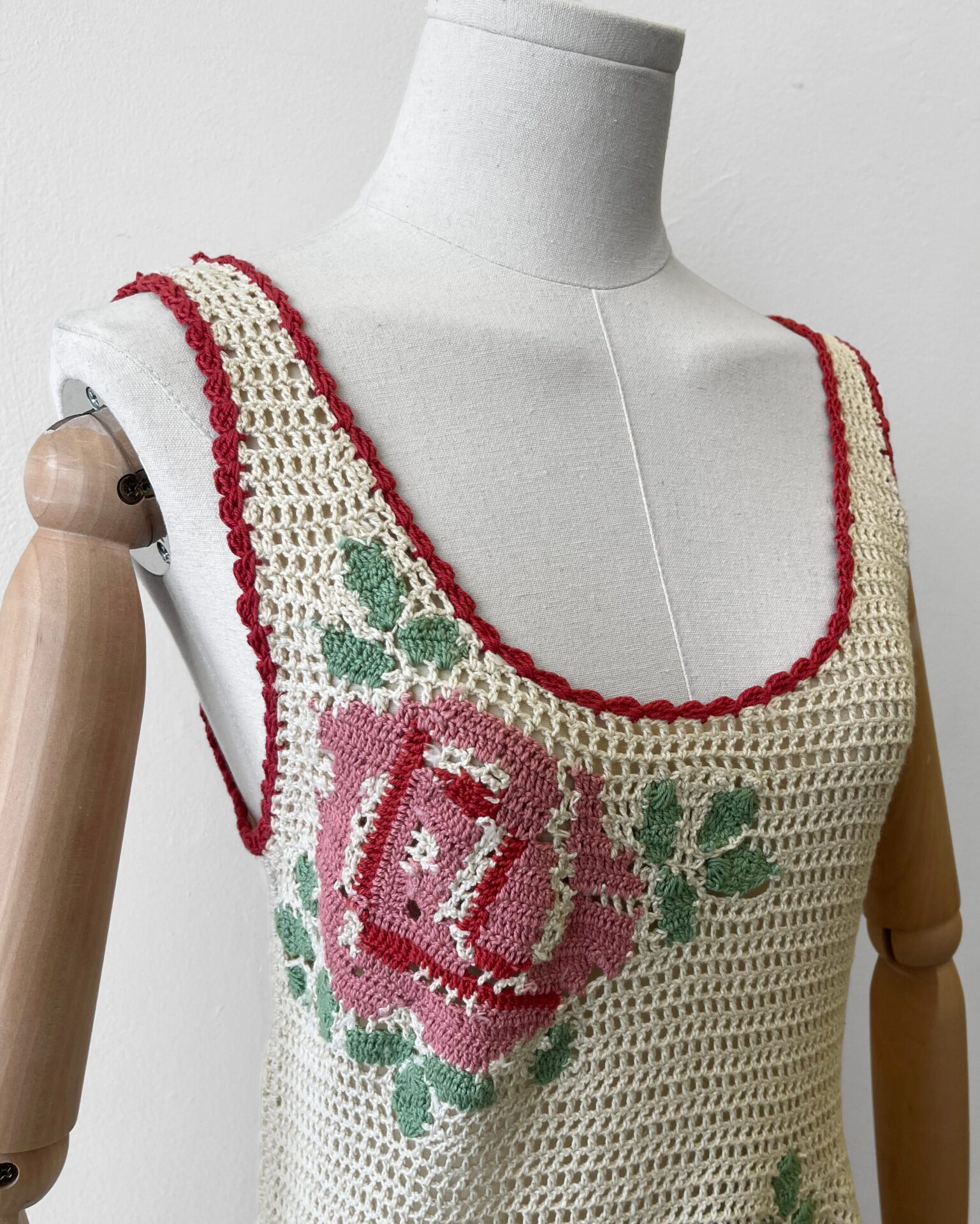 Handmade crocheted beige sleeveless dress with floral details and red trim.