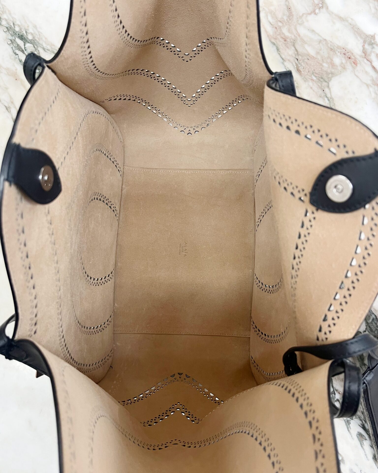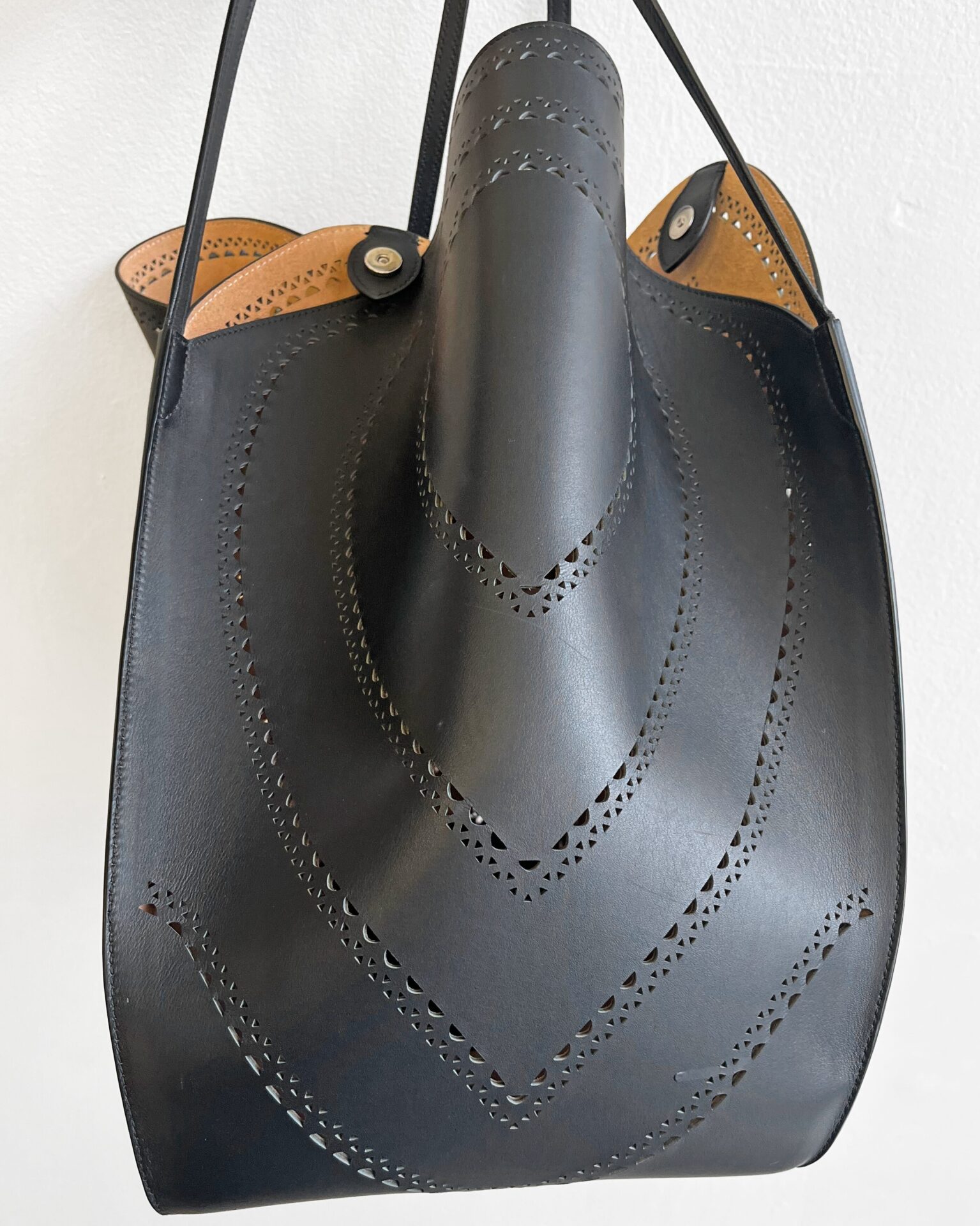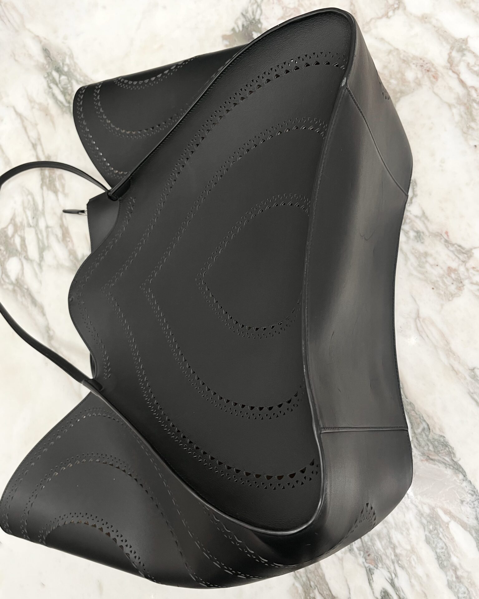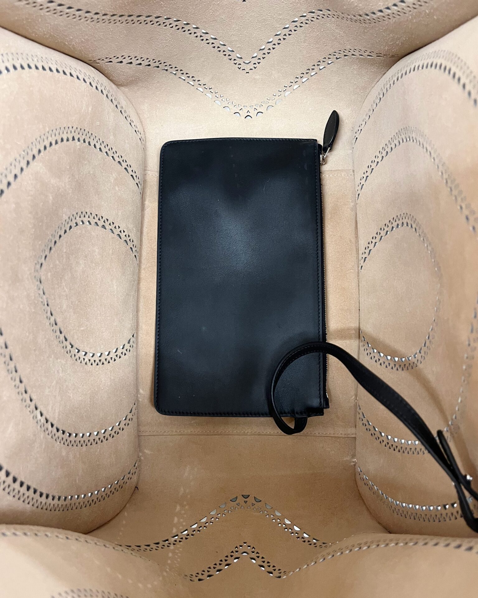 Gorgeous Alaia Lili 32 black leather tote bag purse, featuring lazer cutouts and attached wallet. Includes dustbag.
