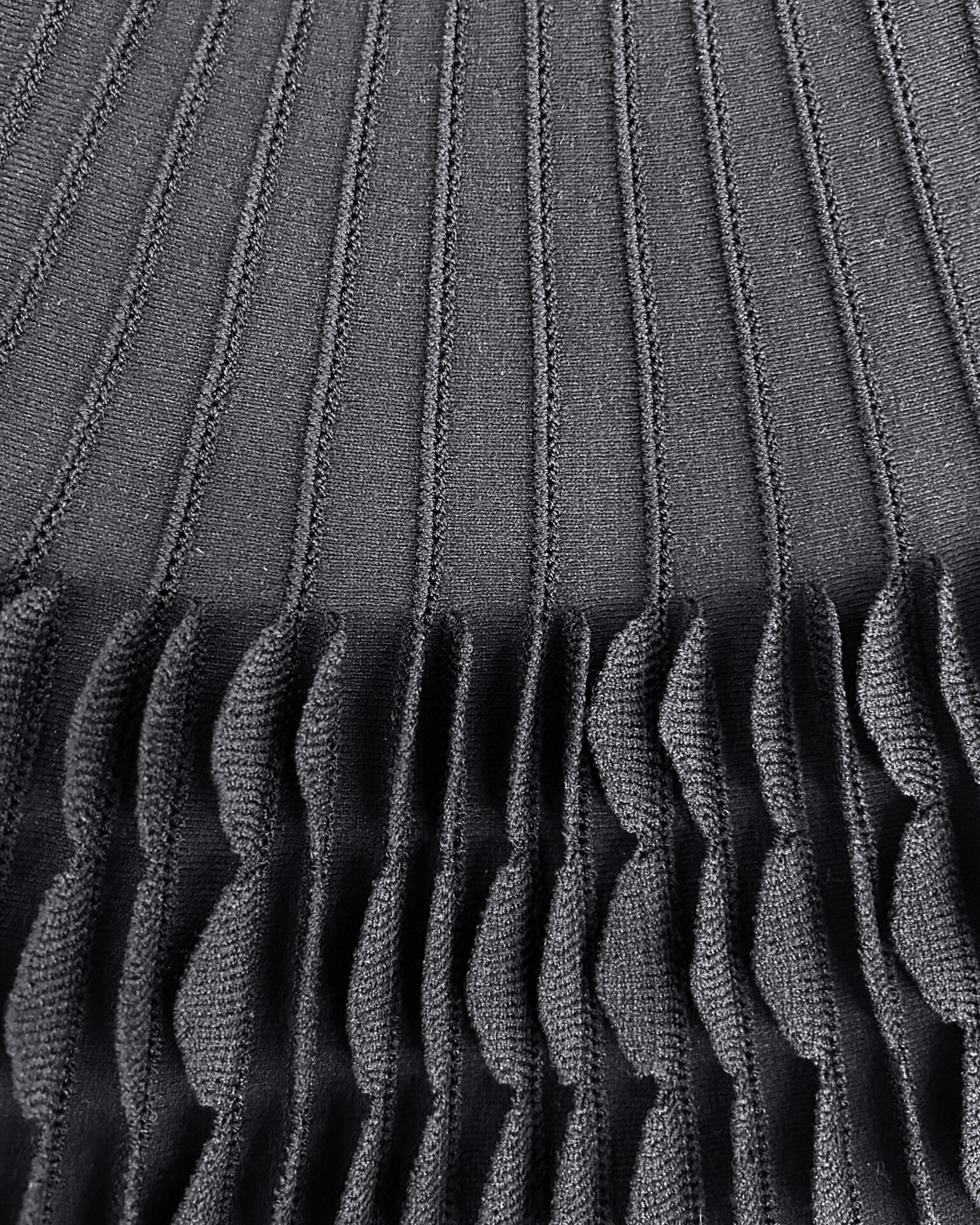 Long sleeve, black ribbed knit dress, with petal like detailing at the skirt and wrists. The dress also has a v-neck and back zipper.
