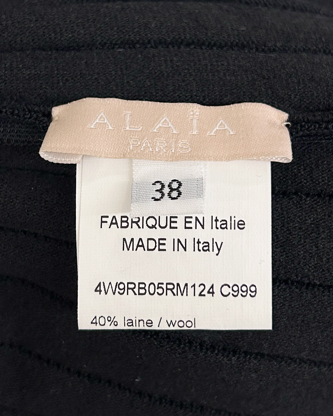Stunning 1992 runway Alaïa ribbon printed knit dress. This dress has a quality medium weight black knit base with a magenta and grey ribbon pattern with white accents wrapping around the body and sleeves. It has long slim sleeves, a back zipper closure from the neck to the waist and another zipper that opens up from the hem to mid calf. This dress is long and fits tightly yet comfortably on the body, thanks to its stretchy knit fabric. Material content: 90% viscose, 6% polyamide, 4% elastane. Condition: Amazing! Overall condition is incredible, with the only wear being a little bit of pilling in a few spots.