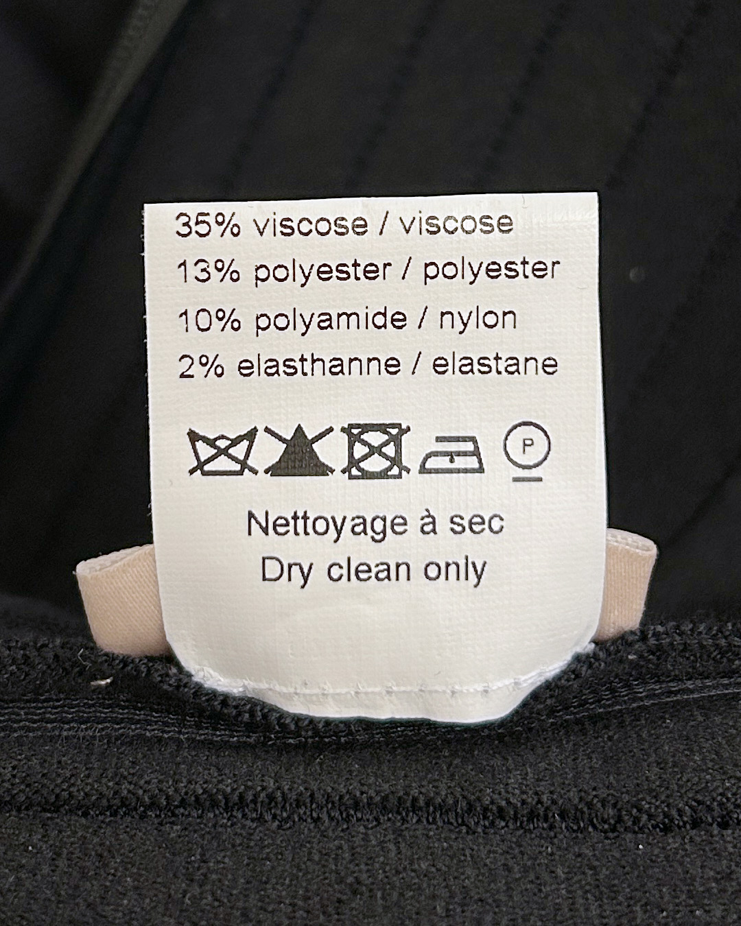 This textural black wool dress by Karl Lagerfeld for Chanel is a two-for-one with detachable sleeves for two totally different looks. A blend of wool and spandex makes this dress incredibly cozy and very comfortable. It features a ribbed body with contrast trim at the waist and a pleated, tiered skirt. The long sleeves are affixed with two black Chanel branded buttons. Condition: excellent with very minor pilling indicative of minimal wear.