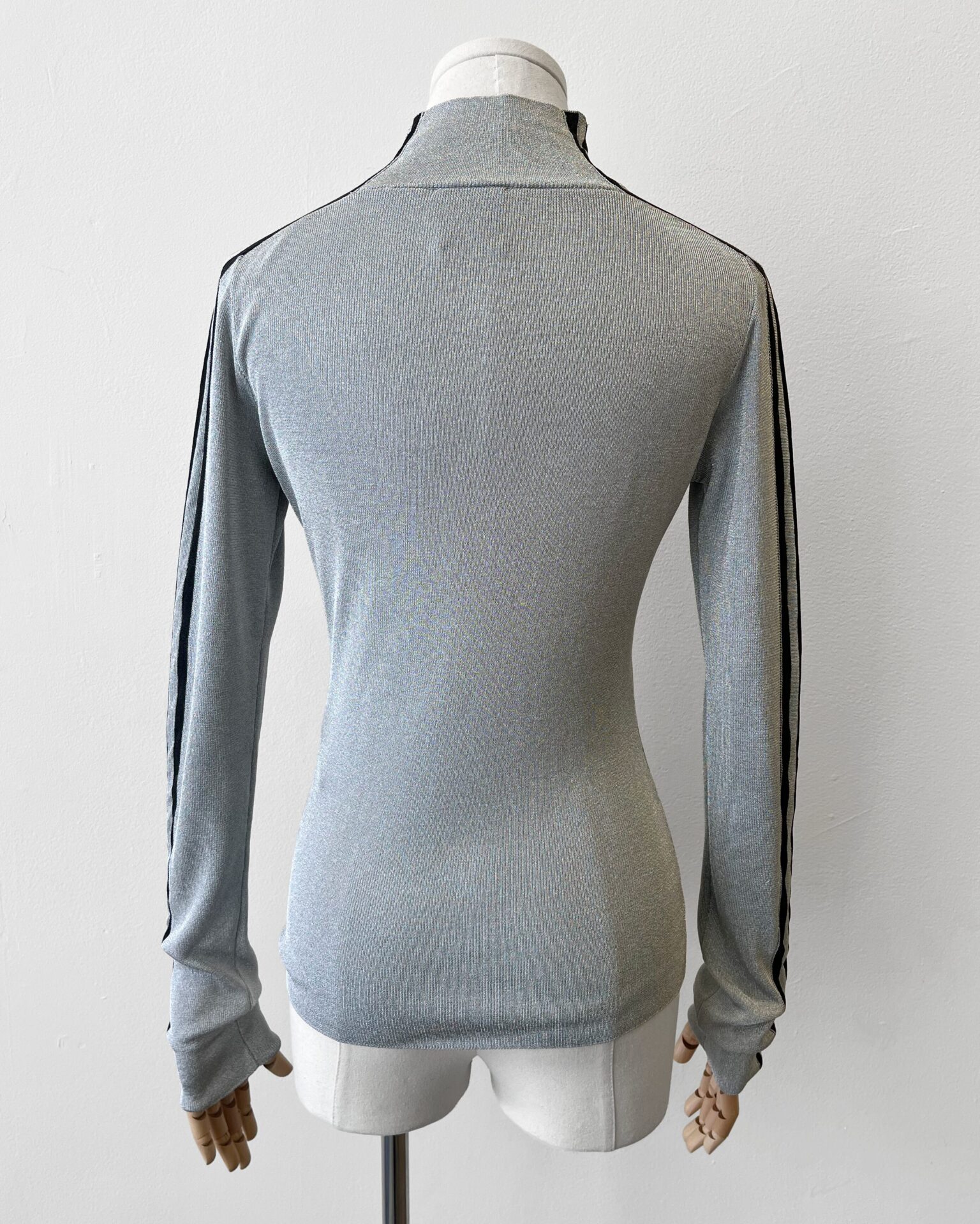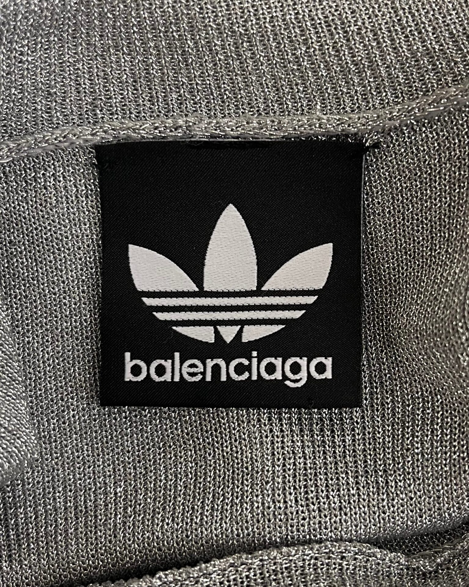 Balenciaga X Adidas high neck knit top in silver with metalized fibers giving it a sparkly look, and adidas trefoil & 3 stripe details.