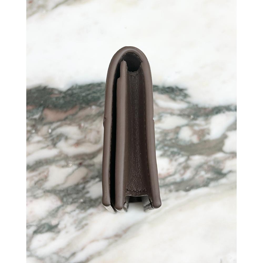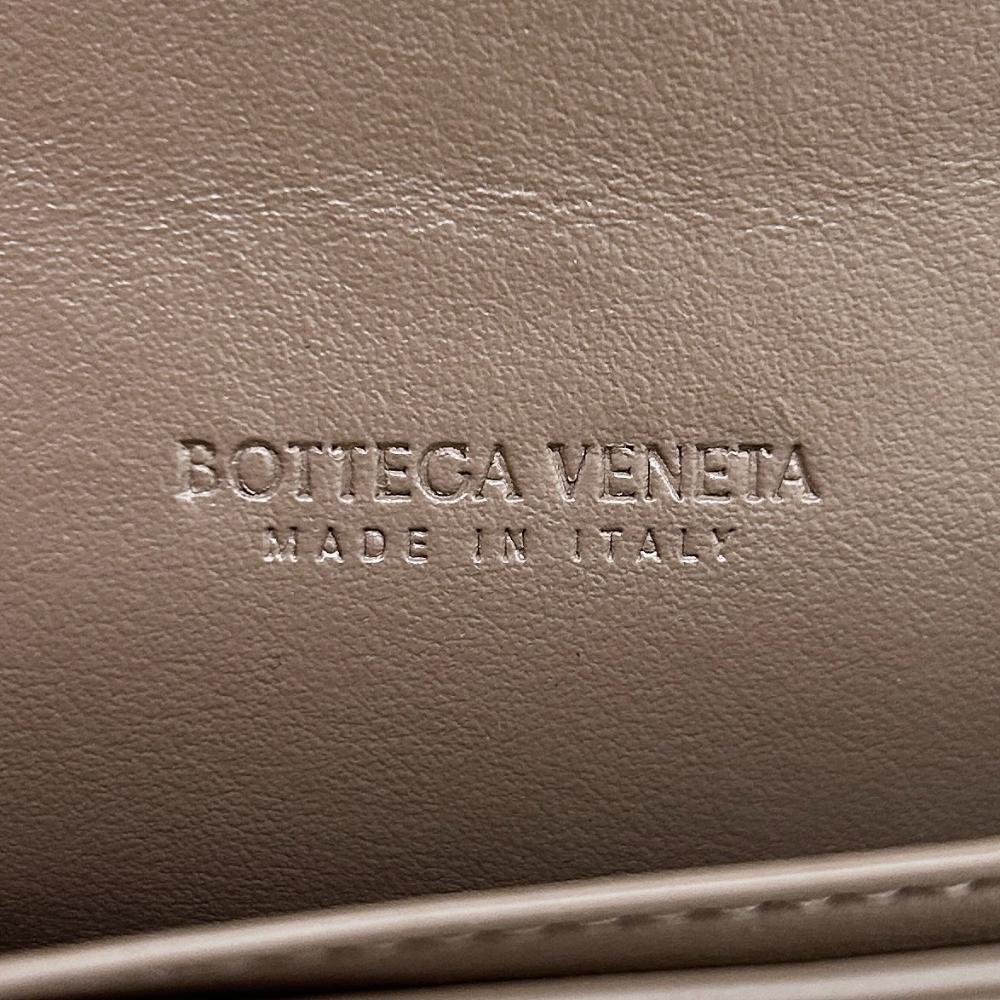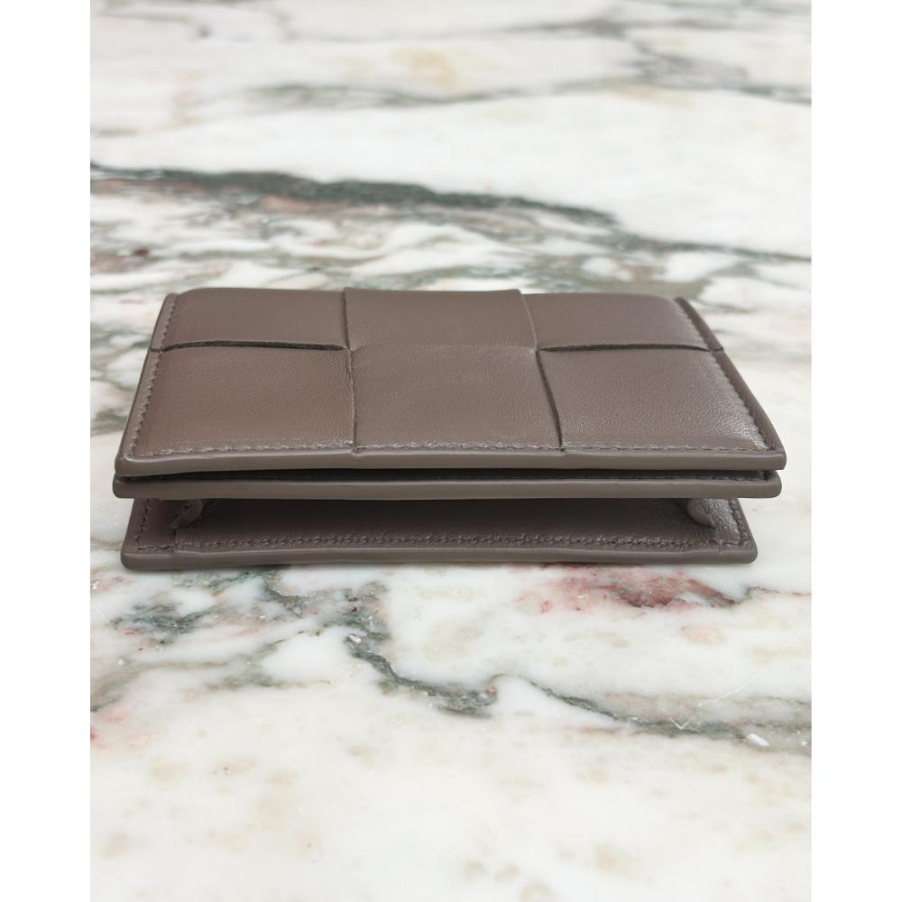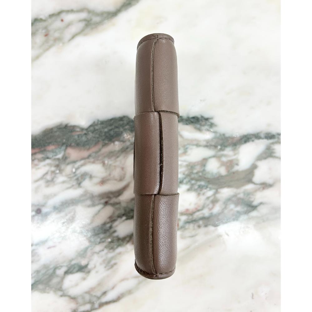 Taupe brown woven leather card holder. It has a snap closure on the front and opens to a matching leather lined interior with two compartments. Dimensions: 4.75″ x 3″ x 1″. Comes with it’s original box and dust bag. Condition: Purrrfect. There are a couple natural shallow creases on the outer leather, not from wear.