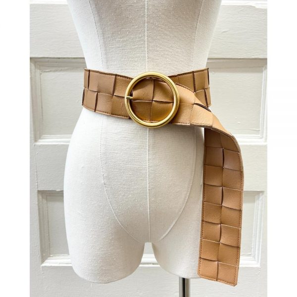 Camel brown leather, woven belt, with a large gold tone circle buckle. Comes with a dust bag. Belt width: 2.375″. Belt length: 39″. This belt can fit up to a 36″ waist, and can be made as small as needed. Condition: Great. One small area of discolouration on the outer leather.