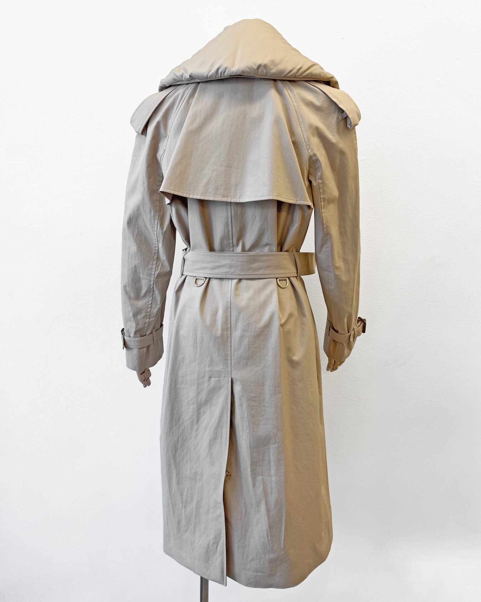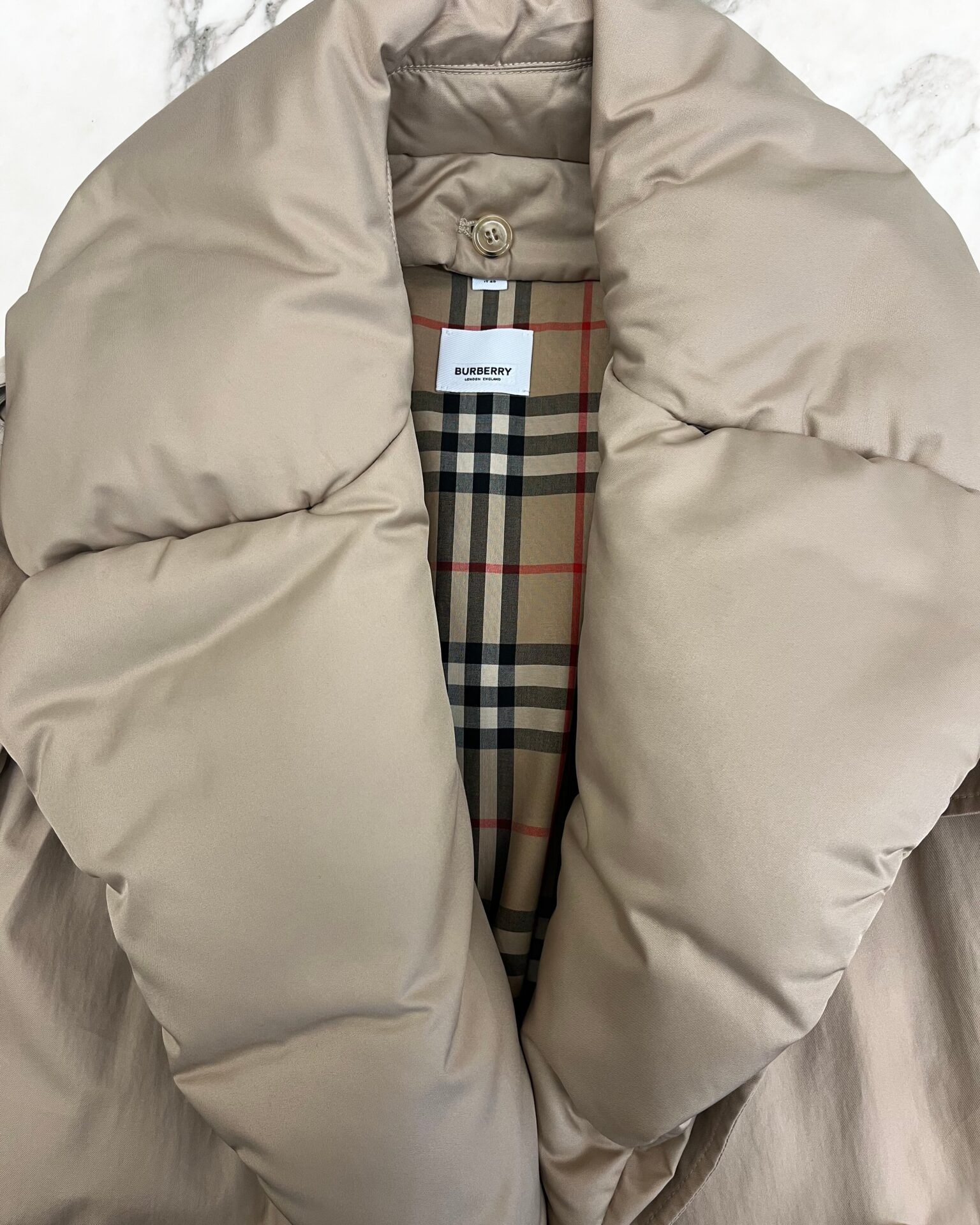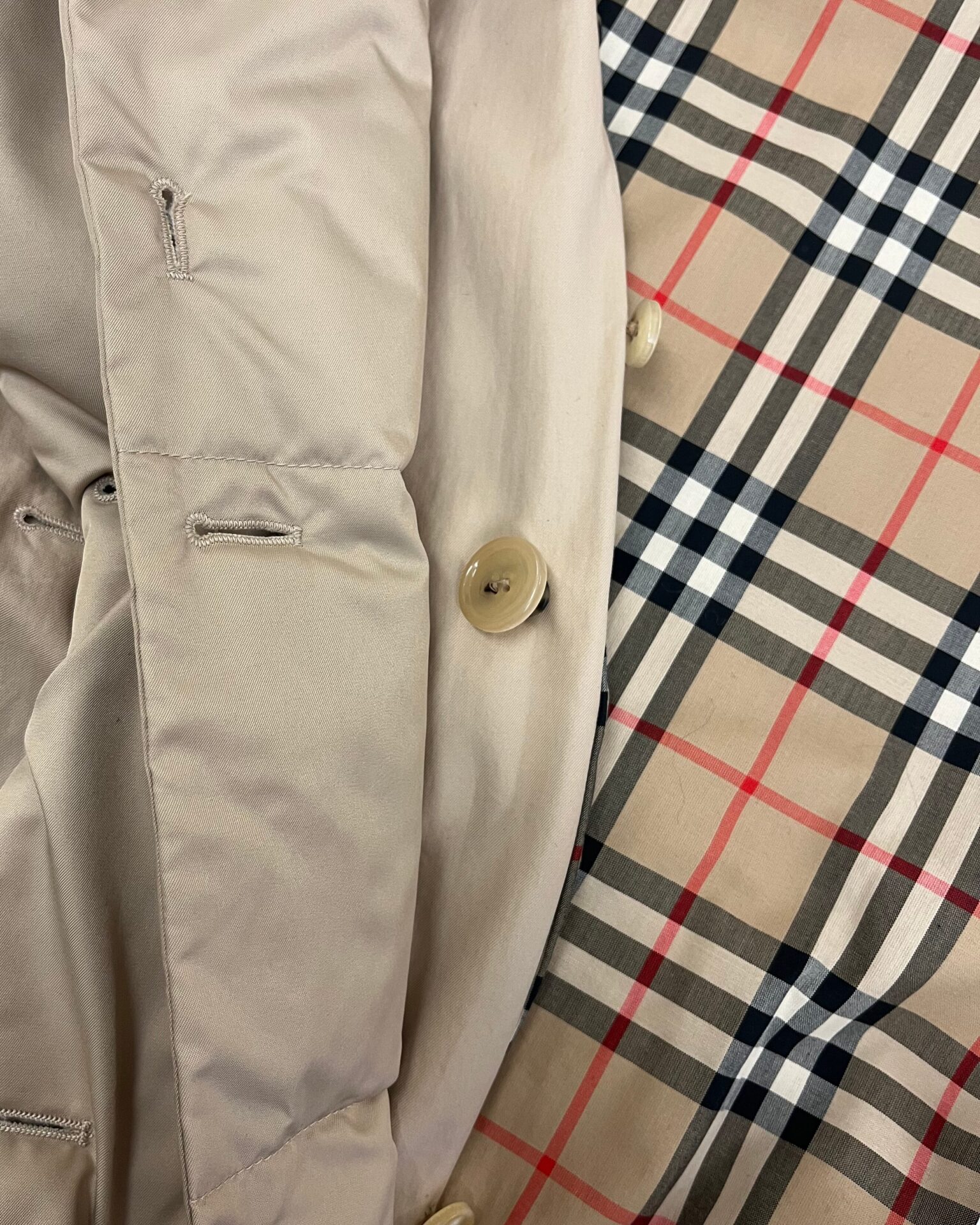 Burberry beige classic cotton trench coat with nova check lining, removable down fill collar, leather buckles and a belt. Includes garment bag.
